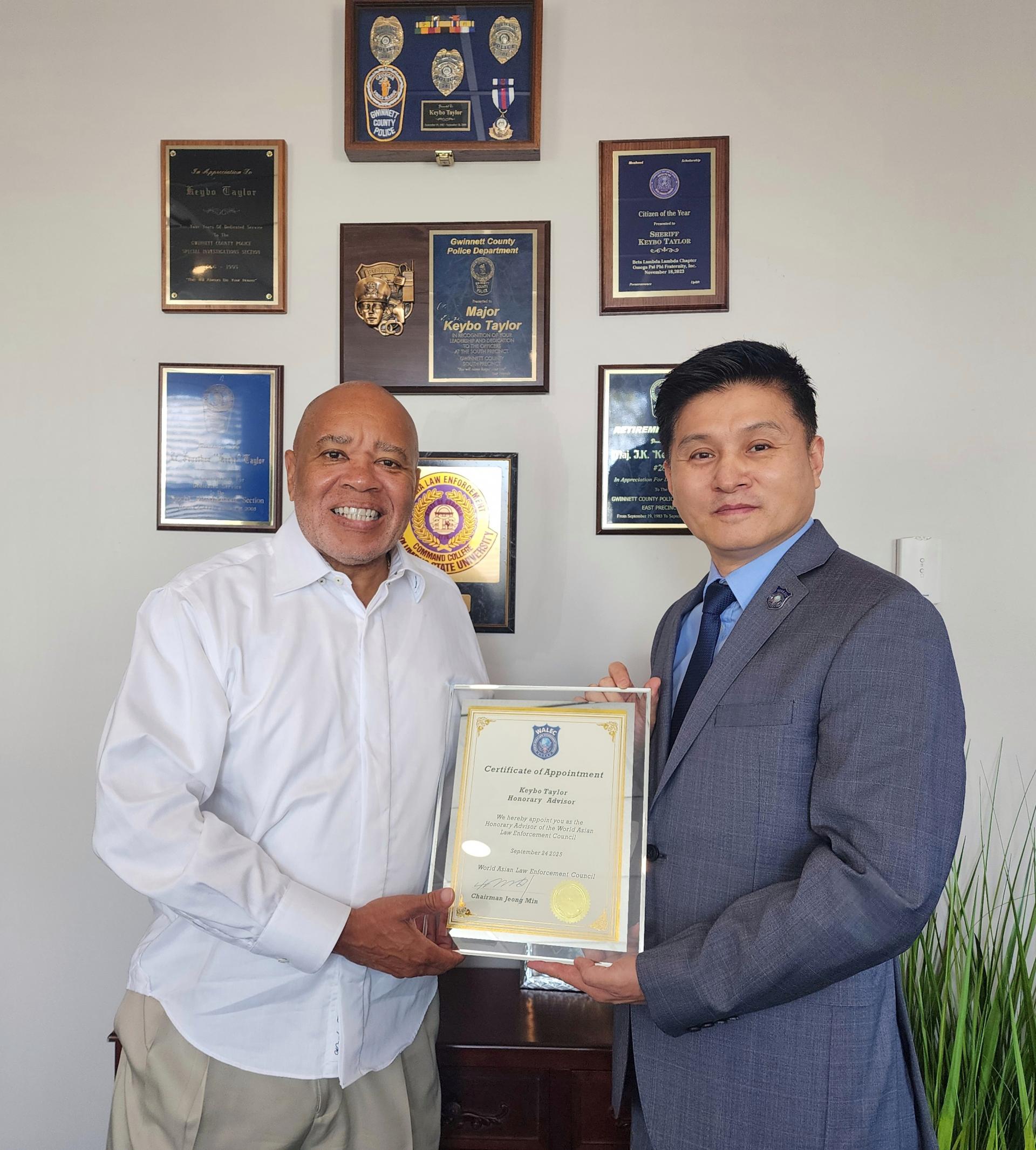 민정기 회장은 키보 테일러(Keybo Taylor) 귀넷카운티 보안관에게 명예고문 위촉장을 전달하며 “앞으로도 한인 커뮤니티와 셰리프국이 더 긴밀하게 협력해 나가기를 기대한다”고 말했다.