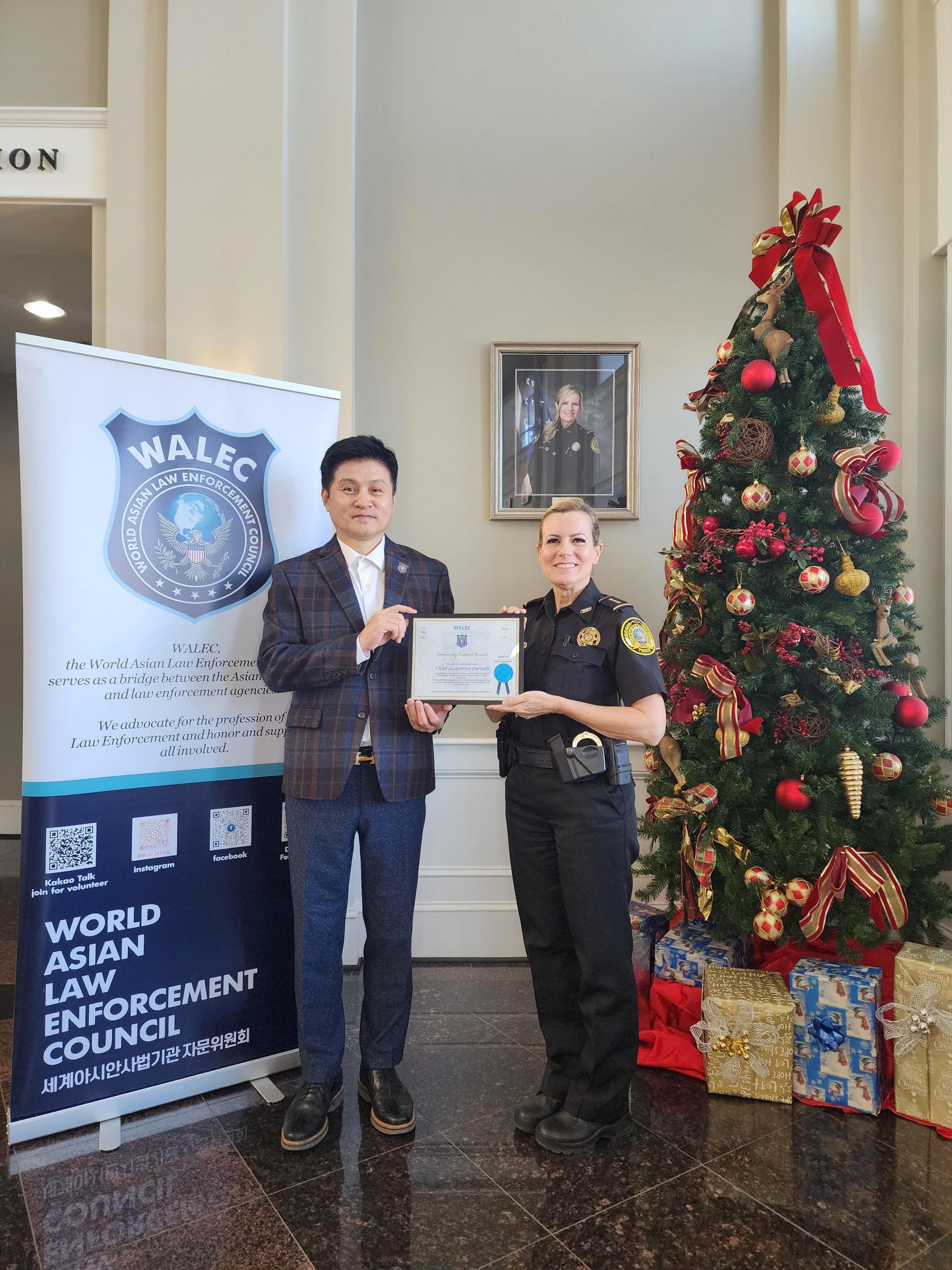 왈렉(WALEC: World Asian Law Enforcement Council)은 11일, 둘루스시 경찰서를 공식 방문하고 재클린 캐러쓰(Jacquelyn Carruth)경찰서장에게 지역사회 지원상을 수여했다.